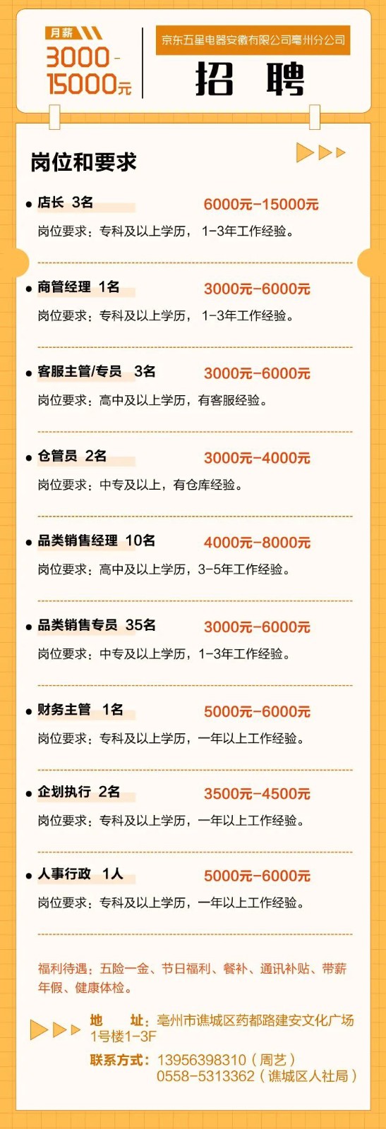 京东五星电器安徽有限公司亳州分公司招聘启事