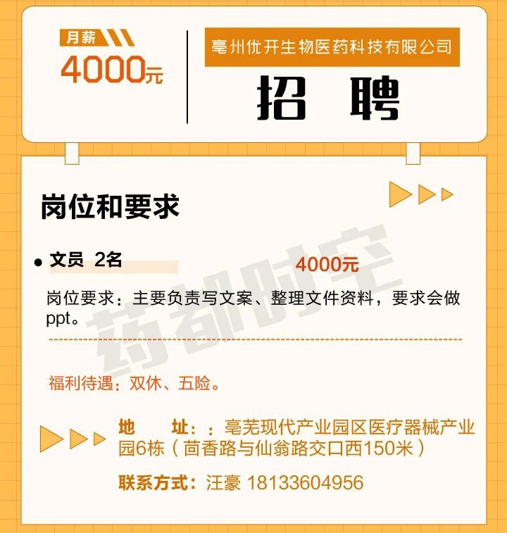 亳州优开生物医药科技有限公司招聘启事