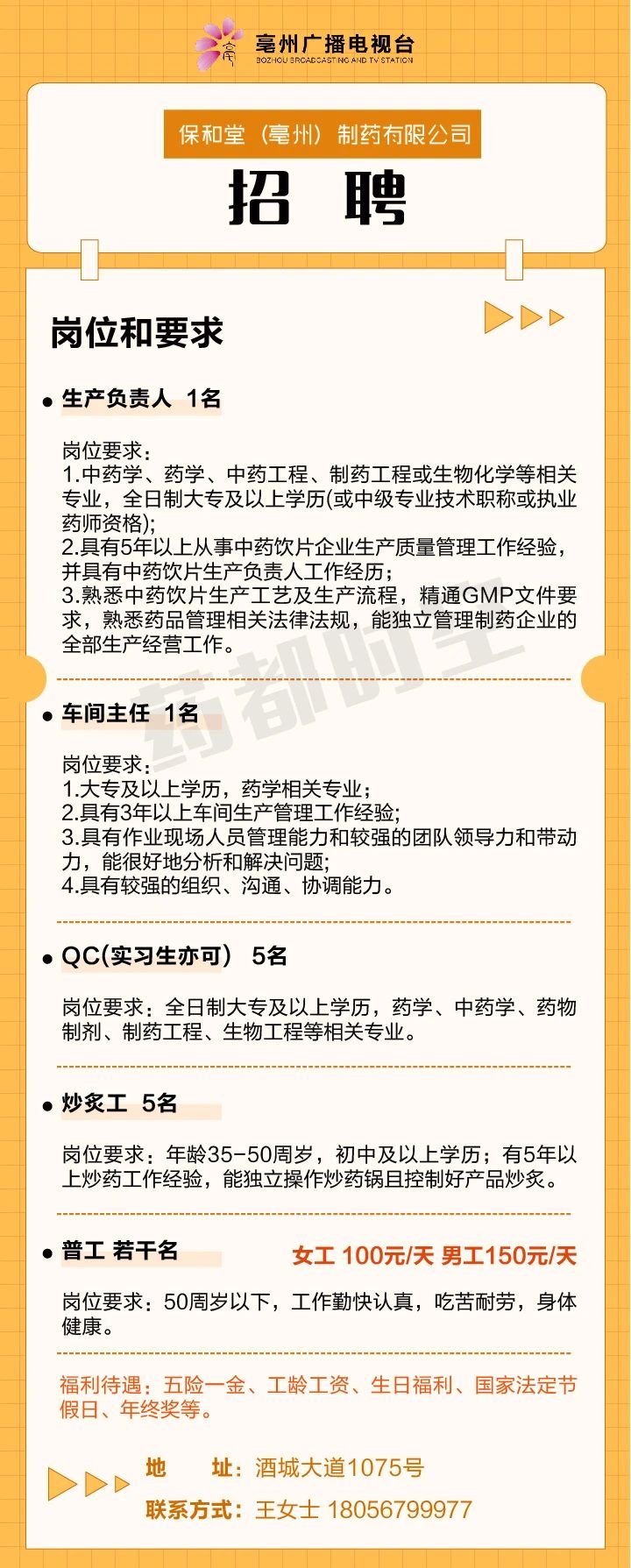 保和堂(亳州)制药有限公司招聘启事
