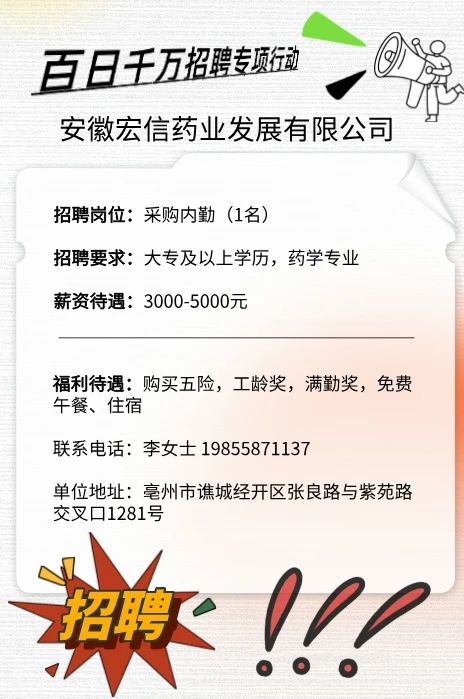 安徽宏信药业发展有限公司招聘启事
