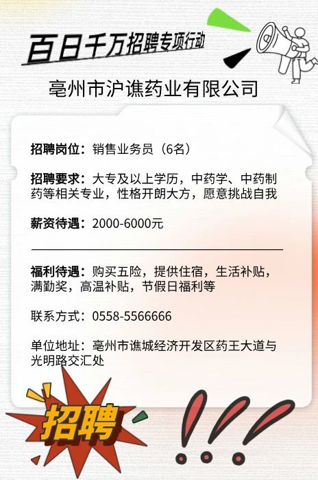 亳州市沪谯药业有限公司招聘启事