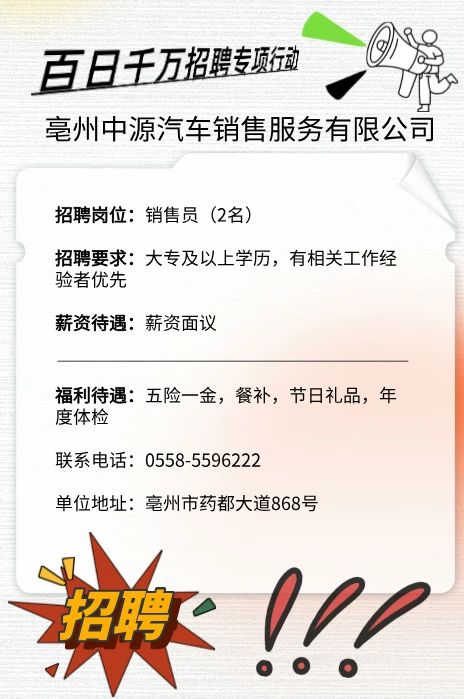 亳州中源汽车销售服务有限公司招聘启事